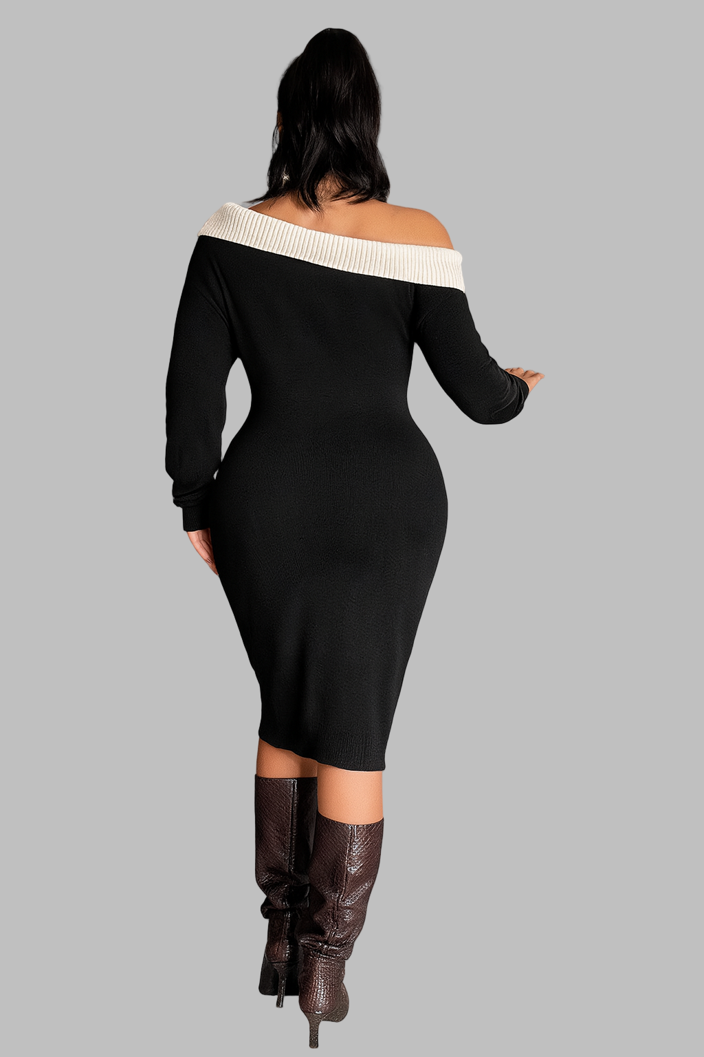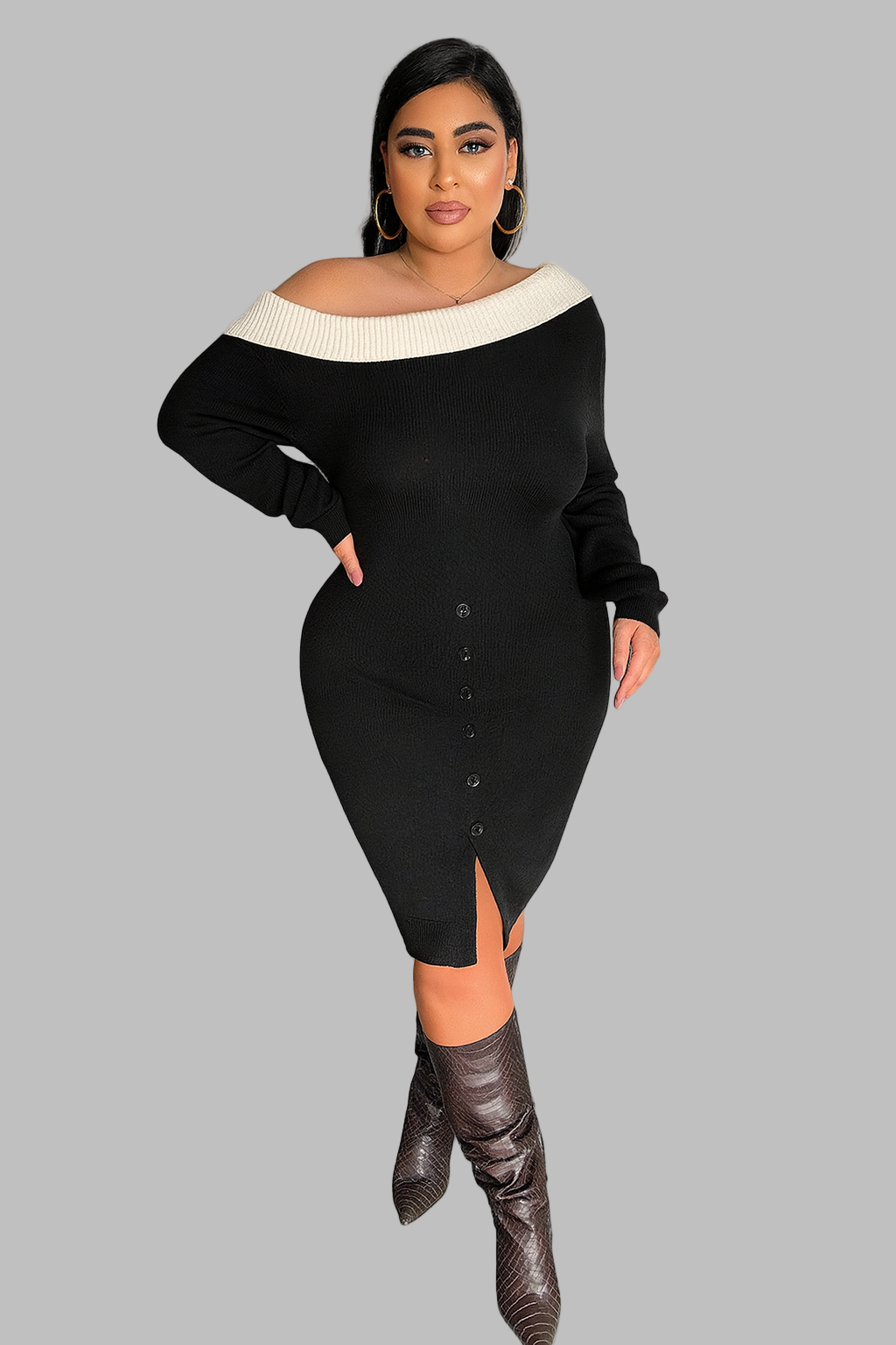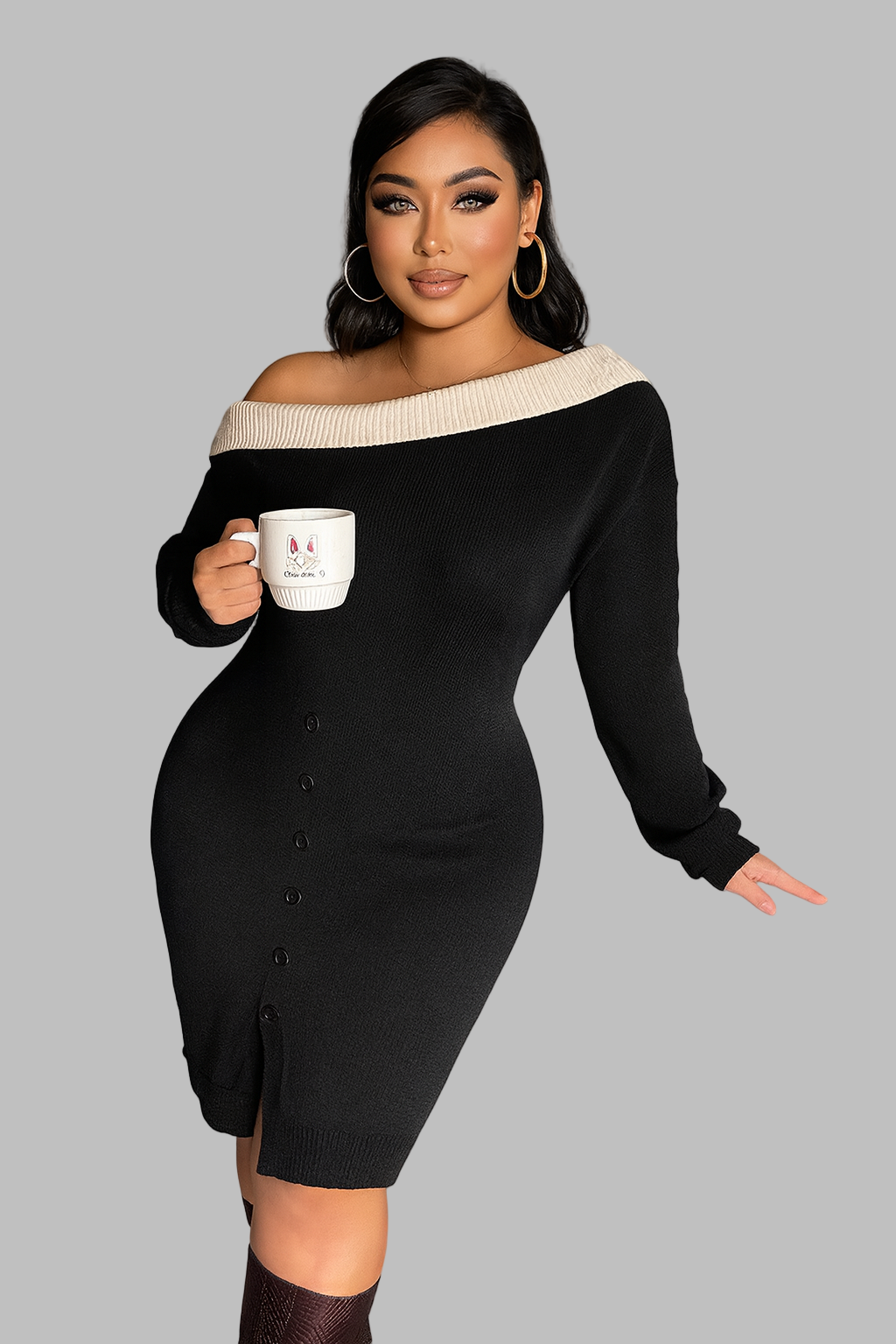 One dress, instant glamour. This eye-catching midi dress features a classic black knit with a bold off-shoulder design and decorative buttons running down the front, which also create a subtle split. It's the ultimate winter piece for those who want to feel comfortable and look absolutely captivating.