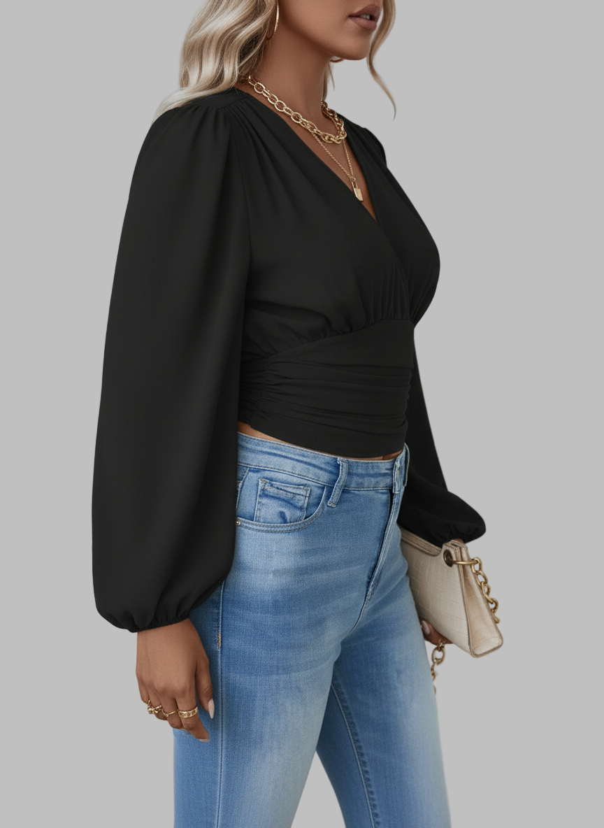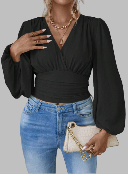 Define your waist and elevate your style. Crafted for elegance, this black top features voluminous, tailored bishop sleeves and a structured, ruched empire waist that creates a beautiful hourglass shape. The soft fabric and secure wrap design offer all-day comfort while keeping your look sophisticated and sleek.