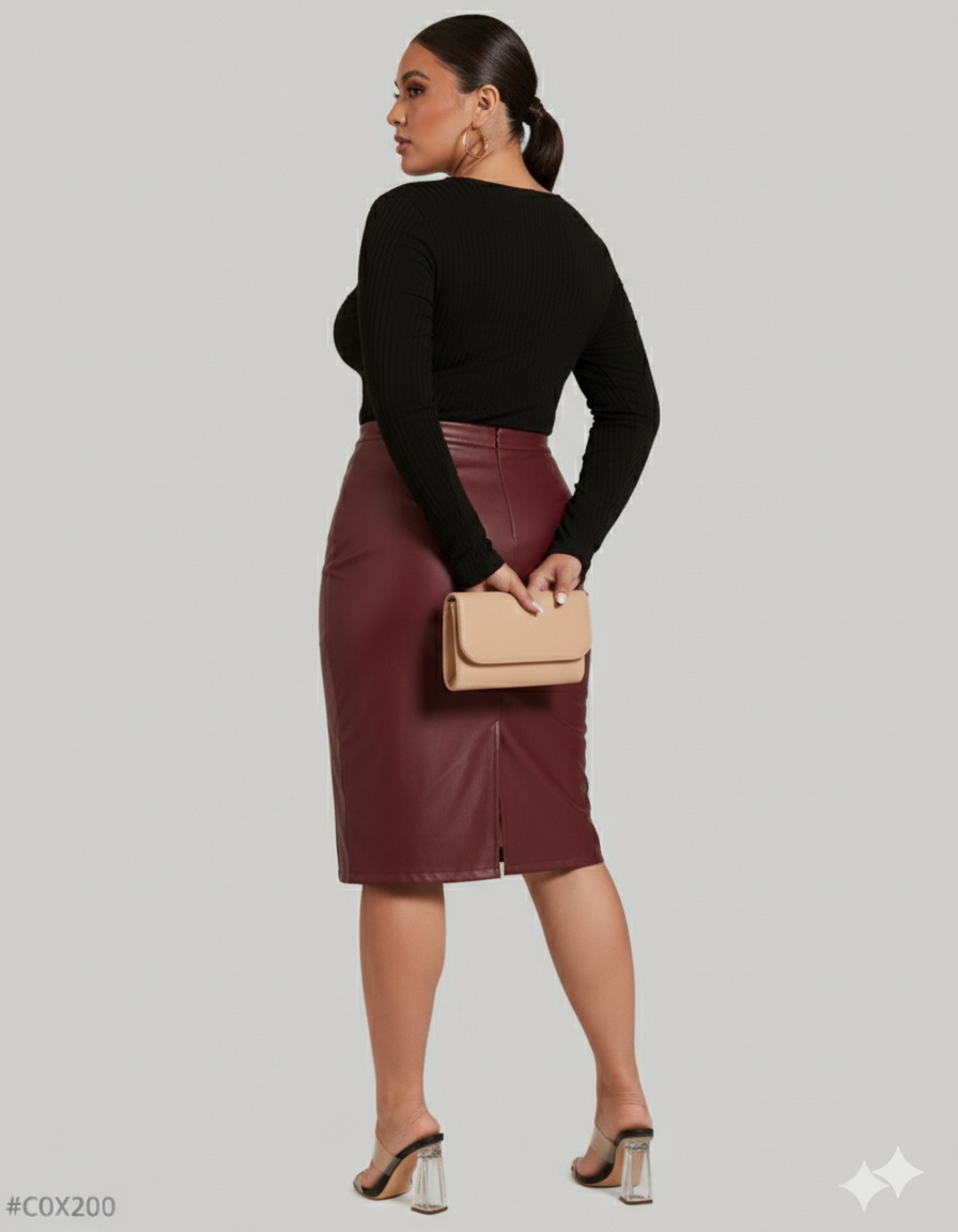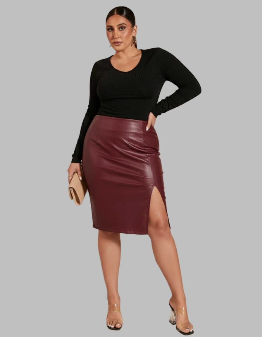 This skirt features a sophisticated midi length and a figure-flattering high-waist pencil cut. The design is elevated by a unique, curved faux wrap-front detail and a dramatically chic side-slit that reveals just the right amount of leg. Finished in a rich Bordeaux (or Burgundy) shade of sleek faux leather, this skirt is a powerful piece perfect for evening wear or a standout office look.