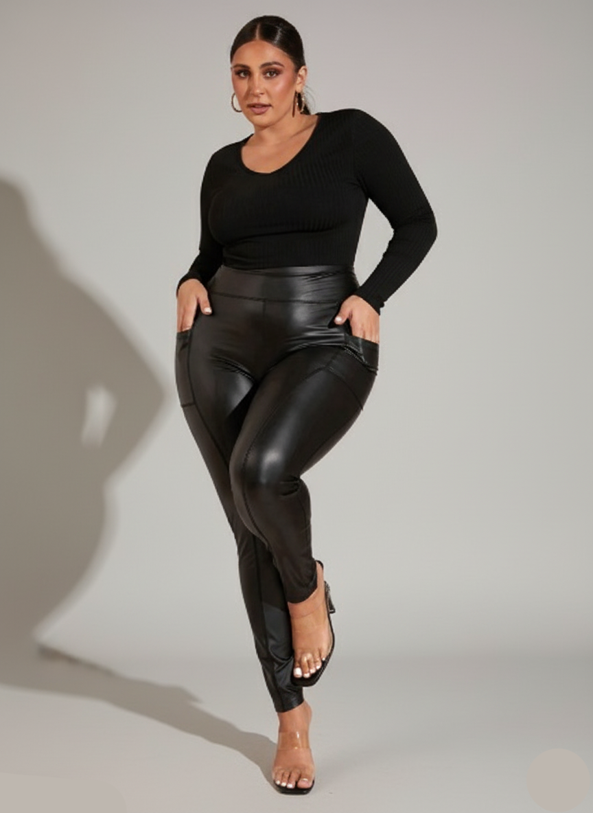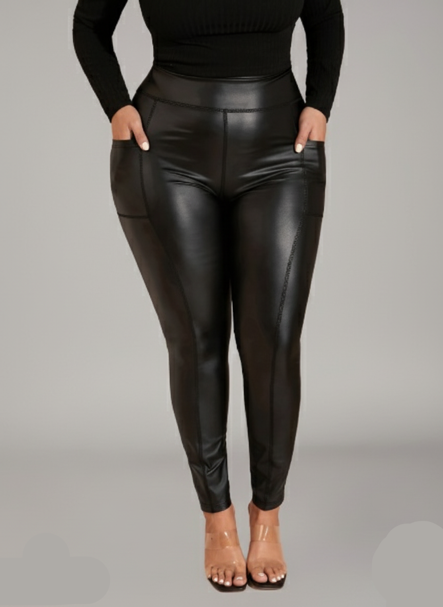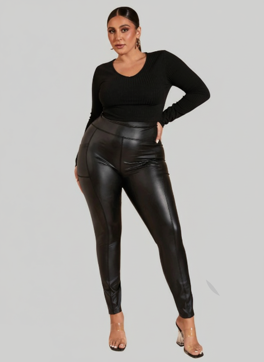 These are sleek, high-waisted faux leather pants designed for a modern, edgy look. They feature prominent seam details running down the front and potentially the sides, which add a structured, tailored feel to the otherwise figure-hugging silhouette. The slight sheen of the faux leather gives them a sophisticated, bold finish, making them perfect for dressing up or down.
